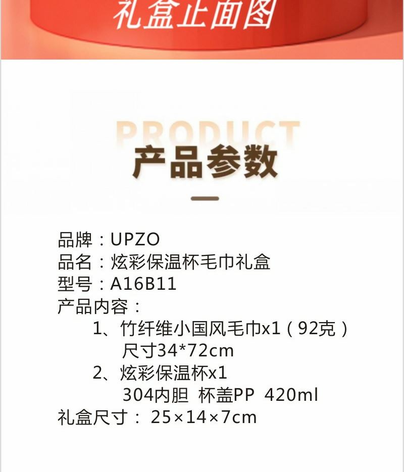 型號: A16B11 產(chǎn)品內(nèi)容 1、 竹纖維小國風(fēng)毛巾×1 起圈部竹纖維 基部棉 92克 34*72CM 2、 炫彩保溫杯×1 304內(nèi)膽 PP杯蓋 420毫升容量 外盒: 25×14×7cm 420毫升高顏值保溫杯 304內(nèi)膽 精美設(shè)計文案 毛巾精選竹纖維材質(zhì) 結(jié)合國風(fēng)刺繡 優(yōu)質(zhì)好禮