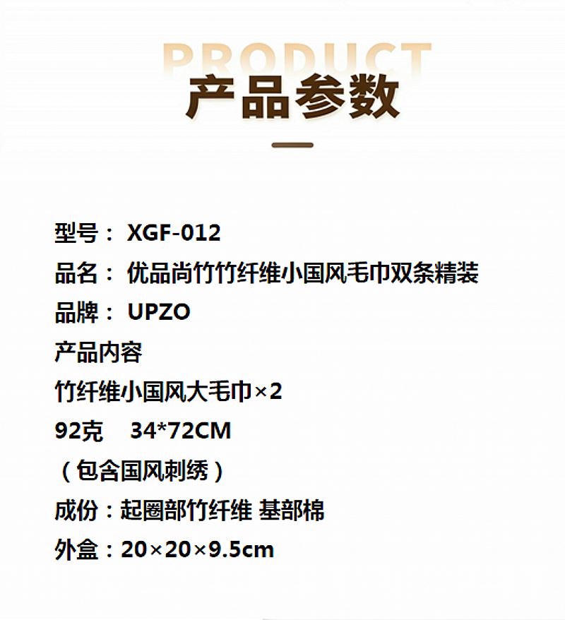 型號(hào): XGF-012 產(chǎn)品內(nèi)容 竹纖維小國(guó)風(fēng)大毛巾×2 92克 34*72CM (包含國(guó)風(fēng)刺繡) 成份:起圈部竹纖維 基部棉 外盒:20×20×9.5cm 精選竹纖維材質(zhì) 結(jié)合國(guó)風(fēng)刺繡 優(yōu)質(zhì)好禮